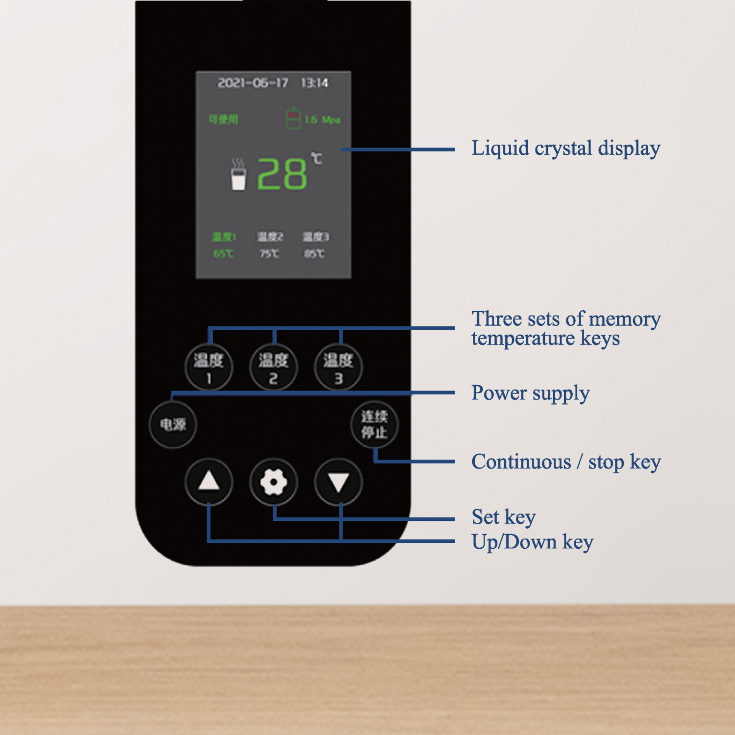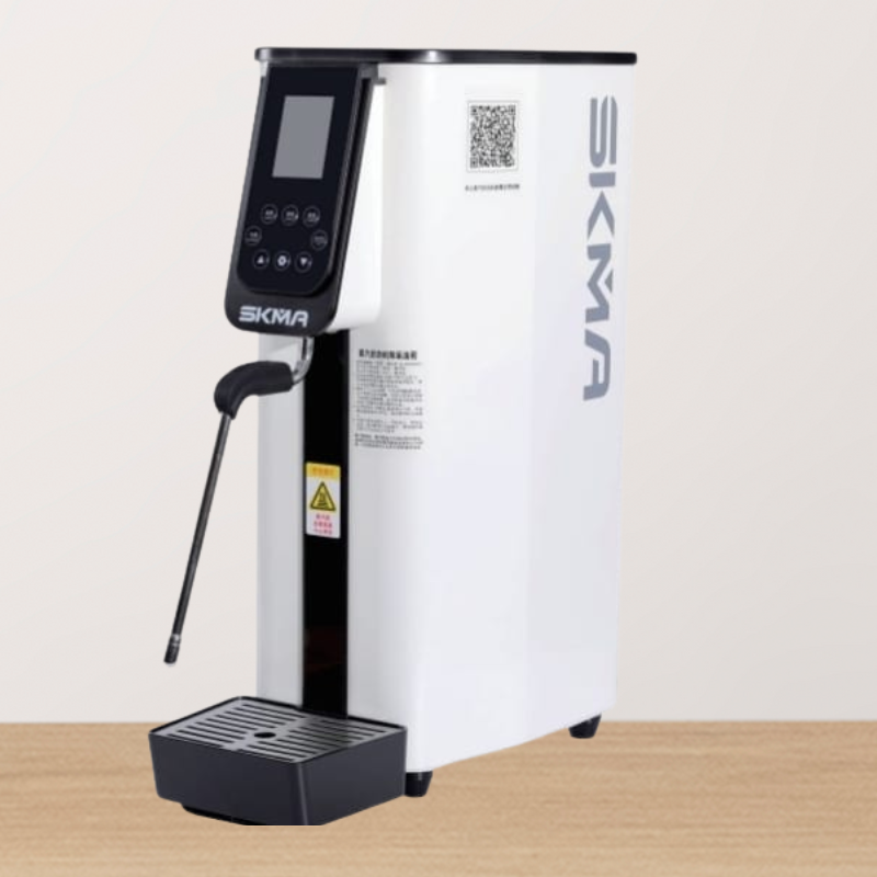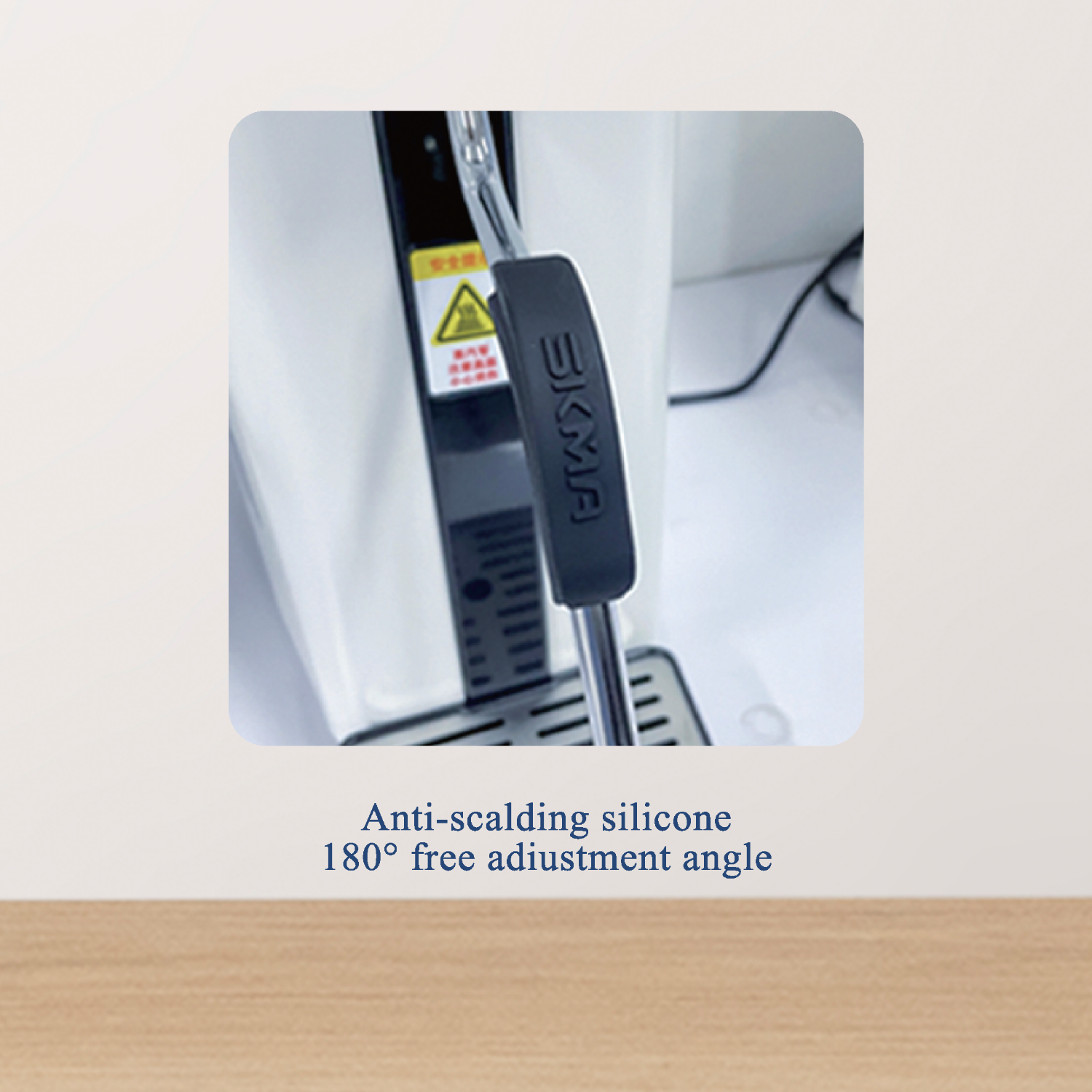 This commercial milk frother features an independent operating system for stable performance, a food-grade boiler for safety, and a self-priming function for convenience. It includes three temperature memory settings, an anti-siphon system to prevent backflow, and uses imported core components for durability. For safety, it offers triple protection: primary and secondary over-temperature protection, and automatic pressure release during overload. The user interface includes an LCD screen displaying real-time temperature and buttons for power, temperature memory, steaming modes, and settings navigation. Designed for ergonomic use, it comes with a 304 stainless steel steam wand, anti-scald silicone cover, and a 180-degree adjustable arm for flexible operation.