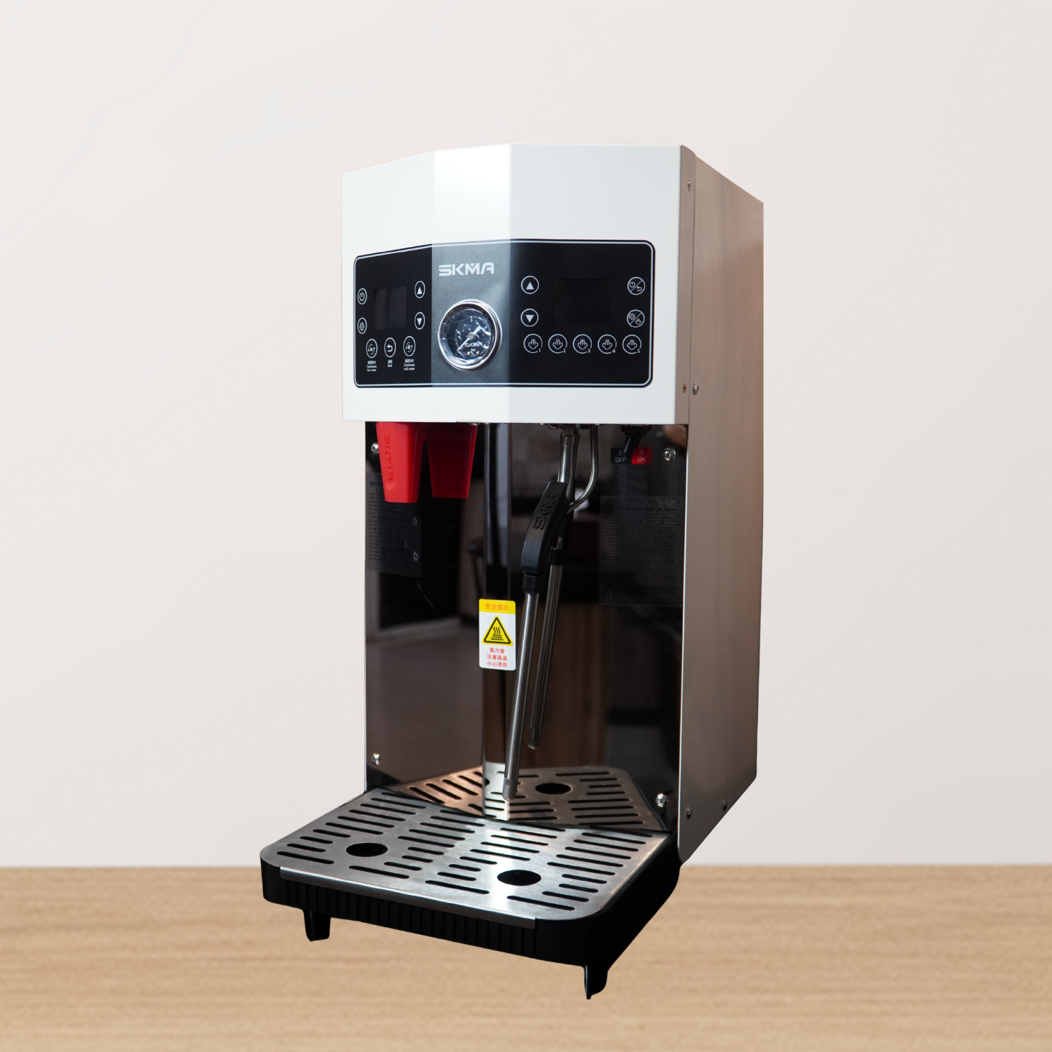 This machine comes with six key features: a low noise level of only 70 dB, independent control of dual boilers, a food-grade boiler, a steam system with five temperature settings to dispense boiling, hot, and cold water, a self-priming pump, and high-quality imported core parts. For safety, it is equipped with three layers of protection, including automatic pressure relief for high-temperature overload, high-temperature system protection, and secondary high-temperature protection. In addition, the machine is supported by independent dual system operation, a 304 stainless steel steam pipe, and a large-diameter water outlet faucet to ensure smoother and more stable water flow.