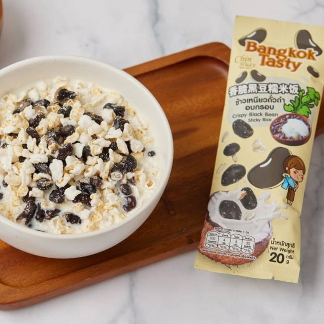 A wholesome, fiber-rich snack made from popped sticky rice blended with crunchy black beans.